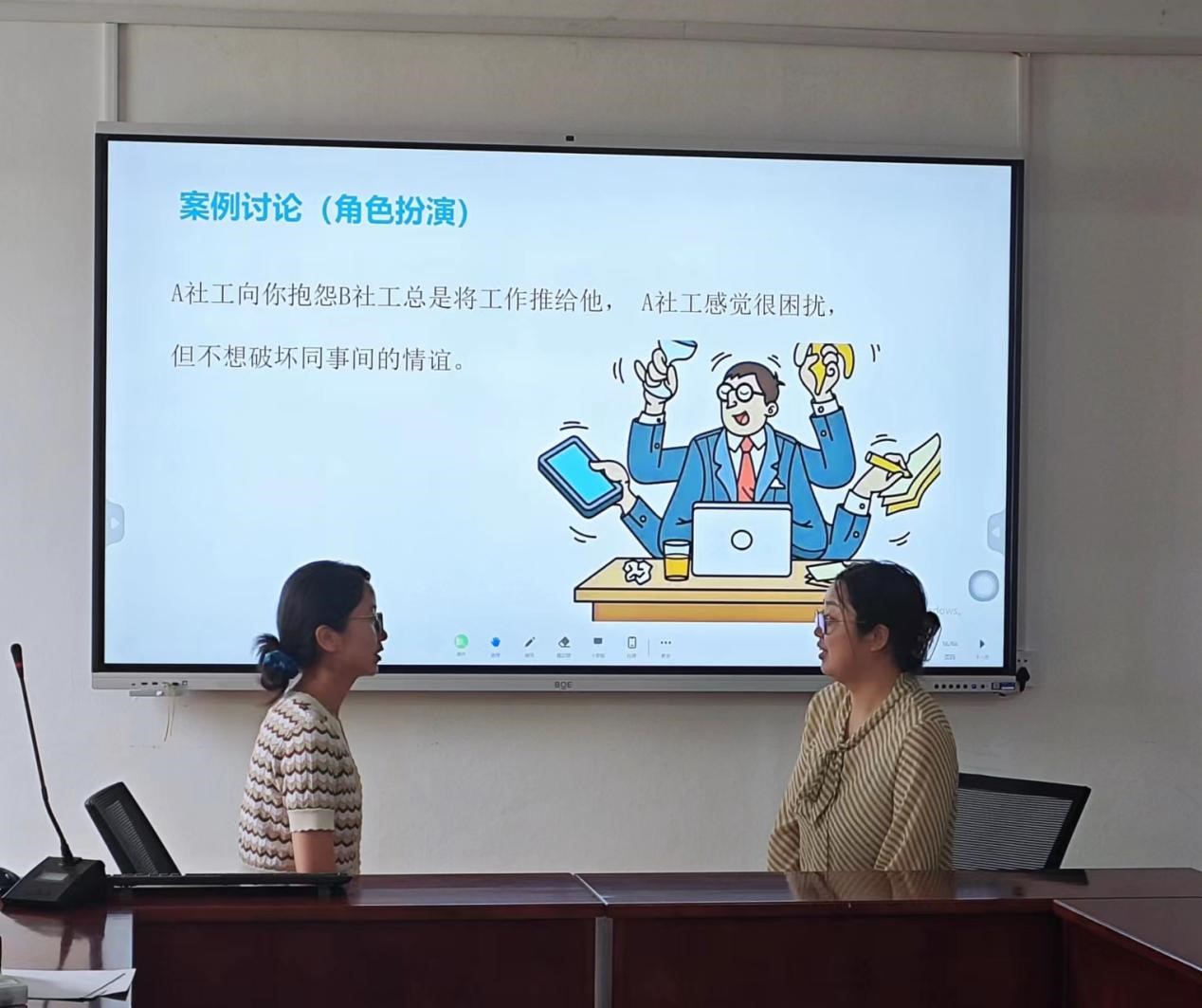 赵莉以“社会工作督导功能”为主题,向参训人员介绍了社会工作行政性、教育性、支持性督导的内容、运用范围、注意事项等。通过案例分析、小组讨论等方式,让参训人员融入日常督导的情境中,结合社会工作督导三大功能,共创解决方案,强化知识吸收。赵莉还分享了社会工作督导三大功能之间的关系,并分析了受督导者的压力源、舒缓受督导者压力的策略与方法。指出督导者应合理使用不同的督导功能,相辅相成,有助于督导目标的达成。