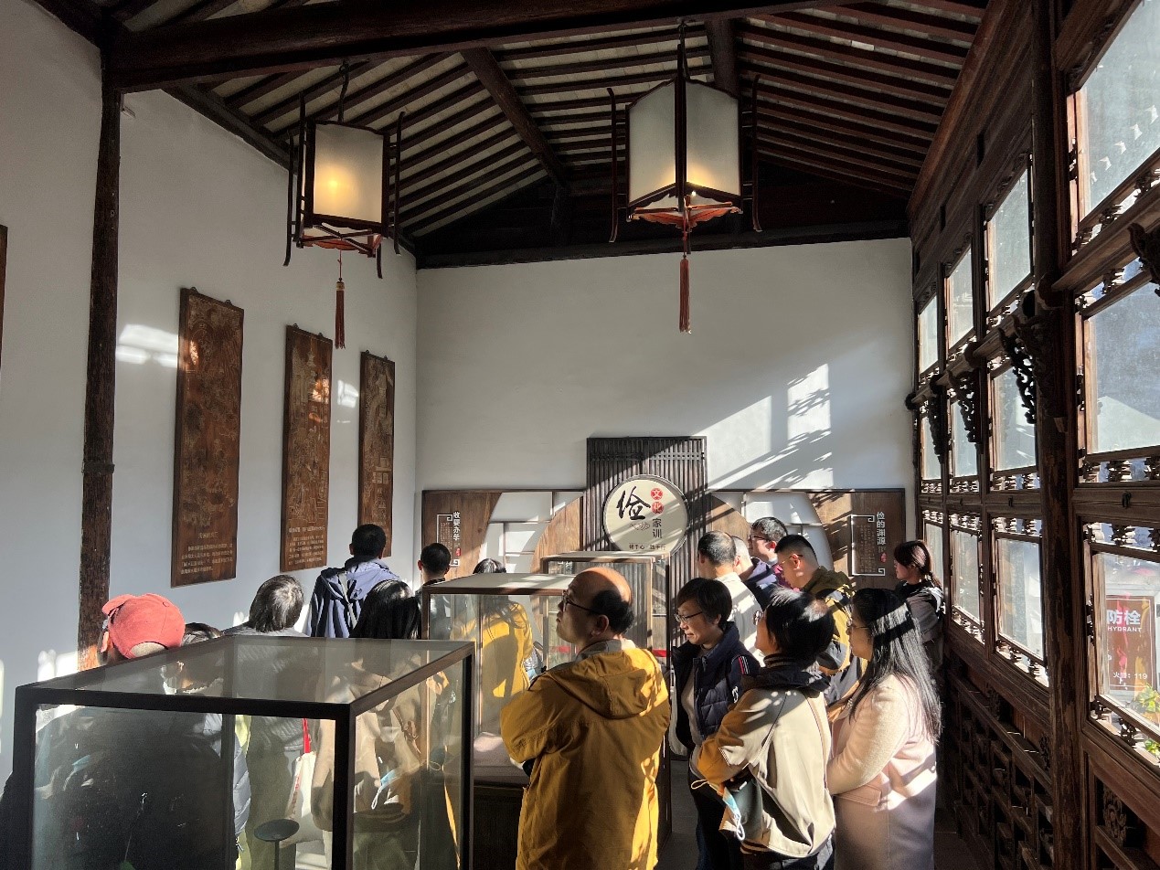 下午,教职工一行前往江村附近的丝业重镇震泽继续田野考察活动。震泽,位于吴江蚕区中心,河网发达,交通地理优势突出,历来是丝业经济繁荣的市镇。考察以师俭堂、慈云寺塔等全国文物重点保护单位为核心,同时注意搜访的历史碑刻与文献资料。“师俭”源出《史记·萧相国世家》“后世贤,师吾俭;不贤,毋为势家所夺”,教职工们一面参观,一面围绕尚俭养德交流讨论。此外,各位教职工围绕丝业经济影响下的社会组织关系、文化思想变迁等问题深入交流讨论。