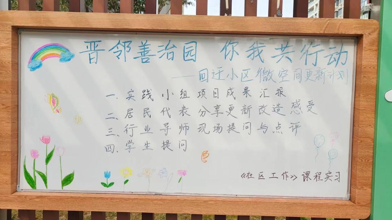 在实景课堂中,《社区工作》课程实习的实践小组同学就实践成果进行现场汇报,在此基础之上,邀请社区居民代表、行业导师与专业指导教师一起结合学生实践选题进行现场点评与答疑,帮助学生切实解决在课程实习过程中遇到的相关问题,以此培养学生认识社区、分析社区、研究社区和服务社区的综合实践能力。