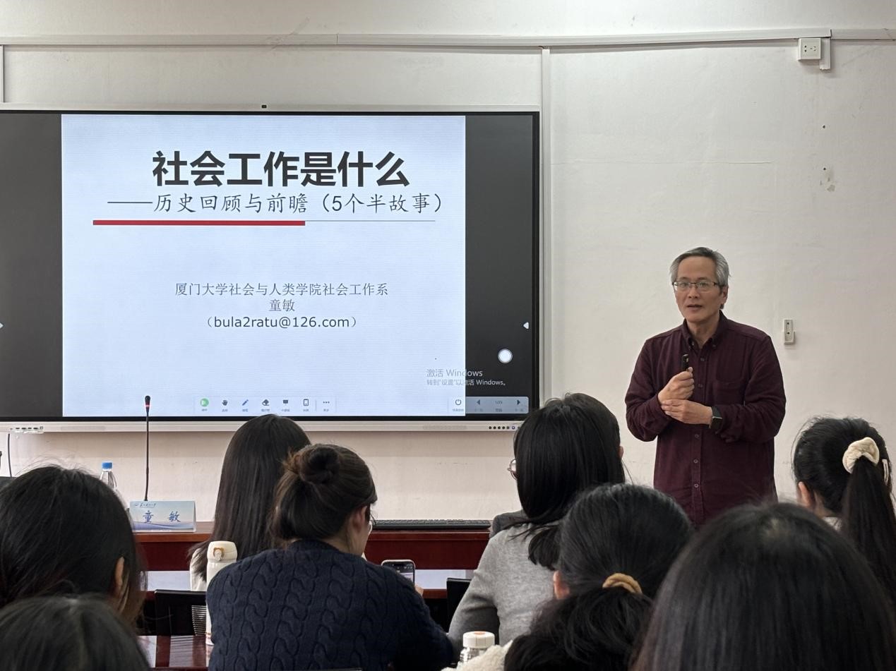童敏教授以《社会工作是什么:历史的回顾与前瞻》为题,回顾了社会工作两位创始人玛丽•芮奇蒙德、简•亚当斯的故事,探讨了社会工作的存在价值以及初期做法,引发了师生对社会工作本质的思考。他指出,回应社会现实问题是社会工作存在的价值基础,也是树立社会工作专业口碑的基本前提。追求本土化的专业适应是现阶段社会工作专业突破发展瓶颈的核心挑战。