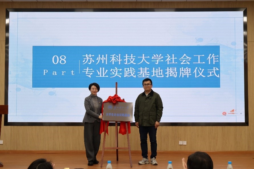 唐利平代表社工专业致辞,她指出社会工作是一项极具使命感的事业,需将专业知识与奉献精神紧密融合,鼓励全体会员珍惜实践机会,积极参与社会服务。校社工协会负责人张净耀作协会年度工作报告,展示了协会一年以来的工作成果。吴中区心行阳光公益服务中心负责人李岚受聘为协会行业导师,并分享了作为一名农村社会工作的实务经验与心路历程。协会与苏州市乐仁乐助公益发展与评估中心签订共建“大学生社会实践基地”协议,孟庆艳与苏州市乐仁乐助公益发展与评估中心总干事万飞共同为实践基地揭牌。