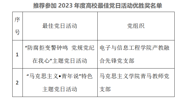 根据江苏省委教育工委《关于做好2023 年度高校最佳党日活动优胜奖申报工作的通知》要求,经评审并经学校党委研究,现将拟推荐参加2023年度高校最佳党日活动优胜奖的党组织予以公示,名单如下: