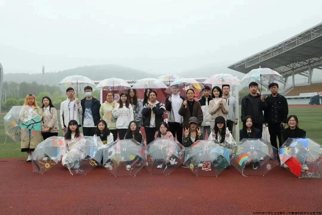 活动现场同学们共同开展了手绘晴雨伞活动,大家积极参与,共同合作,很快在大家的巧手下便绘出了一把把绘有精美图案的晴雨伞。伞上绘梦,各自成景又浑然一体,展现出一种和谐之美,就像我们的民族,百花齐放又凝聚一心,汇集成今日繁盛的中国!