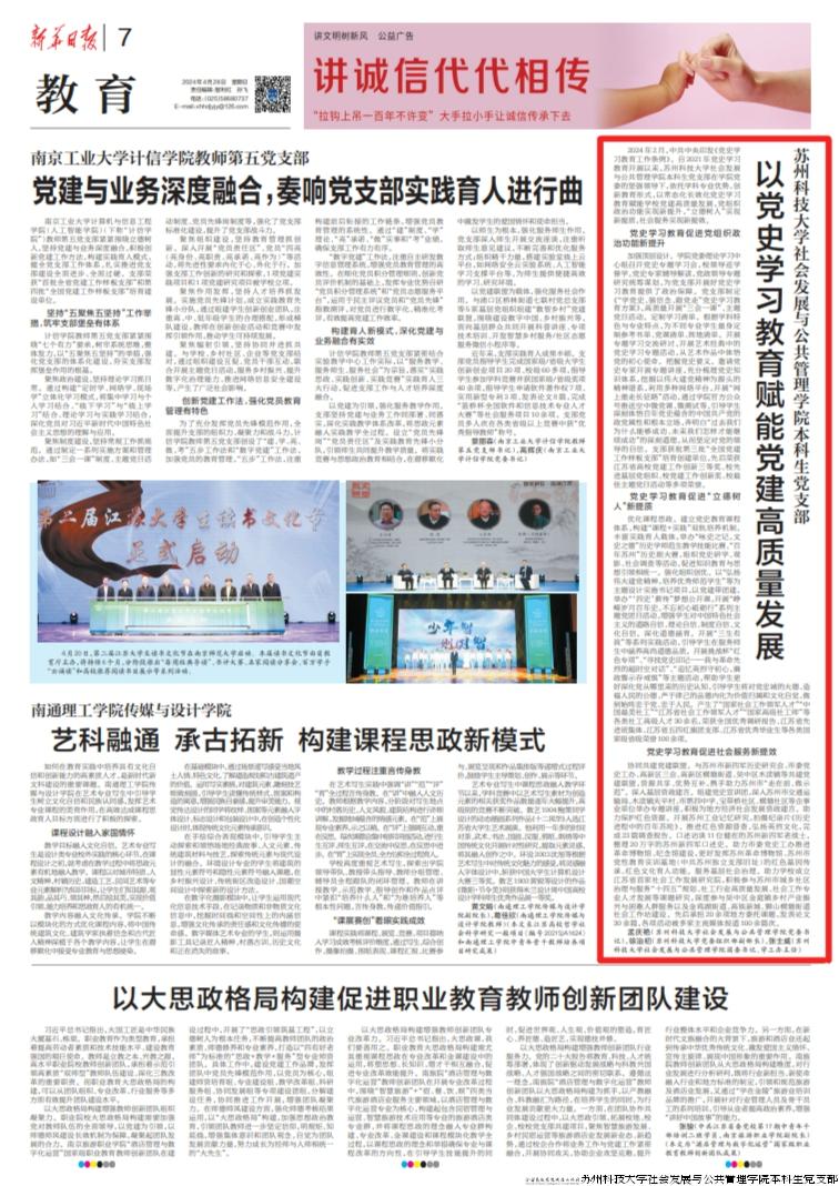 协同共建党建联盟。与苏州市新四军历史研究会、市委党史工办、高新区三会、高新区横塘街道、吴中区木渎镇等共建党建联盟,资源共享、优势互补,携手助力苏州市“走在前、做示范”。深入基层资政建言。组建党史宣讲团,深入苏州市交通运输局、木渎镇天平村、市第四中学、宝带桥社区、横塘社区等企事业单位举办专题讲座,积极为地方经济社会发展资政建言。助力保护红色资源。开展苏州工业记忆研究,拍摄纪录片《历史进程中的百年苏纶》。推进红色资源普查,弘扬英烈文化,完成23篇调查报告。口述访谈11位健在的苏州新四军老战士,整理20万字的苏州新四军口述史。助力市委党史工办推进革命博物馆、纪念馆建设,更好发挥苏州革命博物馆、苏州市党性教育实训基地(中共苏州独立支部旧址)的红色基因传承、红色文化育人功能。服务基层社会治理。助力学校成立江苏省首家社会工作发展研究院,积极参与苏州市城乡社区治理与服务“十四五”规划、社工行业高质量发展、社会工作专业人才发展等课题研究,深度参与吴中区金庭镇乡村产业振兴与困难人群服务以及金鸡湖街道、高铁新城、狮山横塘街道社会工作站建设。先后承担20余项地方委托课题,发表论文30余篇,各项活动被多家主流媒体报道100余篇次。