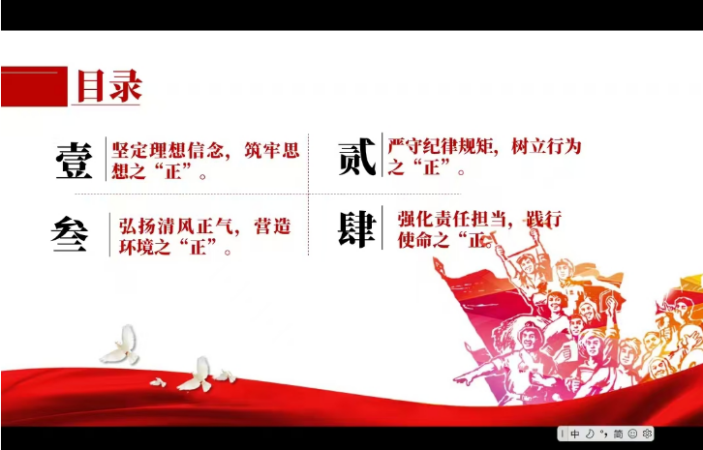 主持人李欣原从行为、环境和使命三个角度来阐述“正”字的含义,并强调了严守纪律规矩,弘扬清风正气和强化责任担当的重要性。她呼吁广大青年自觉学习并遵守党内法规,知敬畏、存戒惧、守底线,自觉接受党和人民的监督,做到言行一致;坚决反对不正之风,抵制腐败现象和不良风气,积极发挥表率作用,践行社会主义核心价值观,引领社会风尚;深刻认识自身肩负的历史使命,敢于担当作为,切实履行职责,坚持以人民为中心,为人民群众办实事。