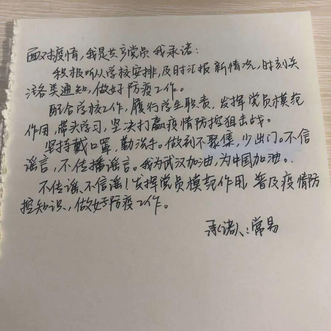 我院本科生党员通过“学习强国”学习平台重点学习习近平总书记对疫情防控的重要讲话和重要指示精神,加强个人理论学习,2月份支部党员学习强国日均学习积分在35分以上。支部结合微信群进行交流讨论,党员带头做到不信谣不传谣,用正能量为抗击疫情发声。在党支部号召下,党员同志们积极响应为抗击疫情发声,纷纷写下了自己的承诺书:“我是共产党员,我承诺,认真学习习近平总书记对新型冠状病毒感染的肺炎疫情作出的重要指示精神,把思想和行动统一起来...”支部党员以最鲜明的态度,践行党员的责任与担当。