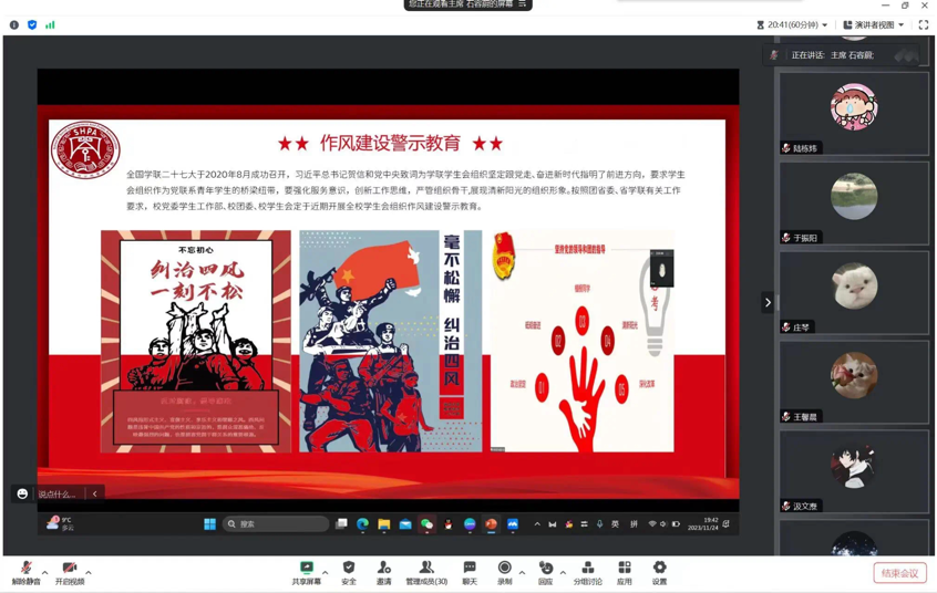 为进一步加深学生会成员对相关制度的了解,严正纪律要求,同时深入学习习近平总书记关于青少年学生成长的重要思想,确保我院学生会紧跟时代步伐,WilliamHILL中国学生会于11月26日线上召开第一次培训会,第六届学生会全体成员参加本次培训会。